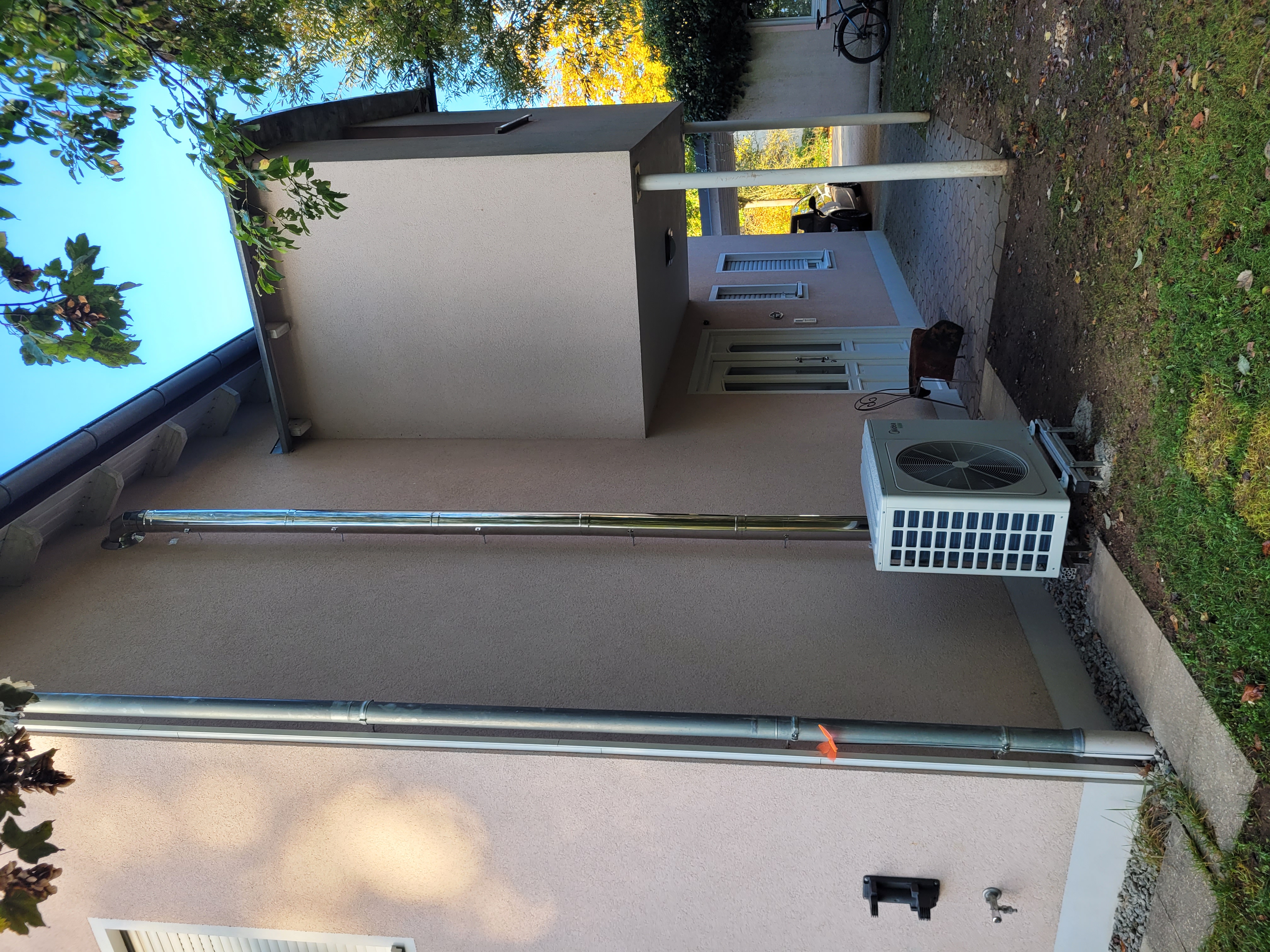 R32 Split Anlage 10 kW mit Verlegung Kälterohre in Edelstahlrohr aussen am Haus zum Dach hoch Einspeisung Heizsystem in Dachzentrale